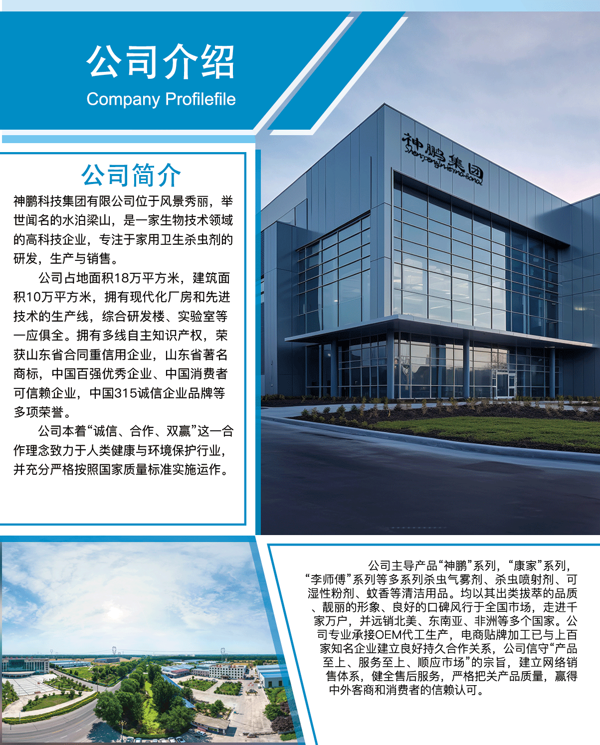 神鵬科技集團(tuán)有限公司是一家專(zhuān)注與生物技術(shù)領(lǐng)域的高科技企業(yè)。其主導(dǎo)產(chǎn)品“神鵬”“康家茉莉”系列殺蟲(chóng)氣霧劑、殺蟲(chóng)噴射劑、殺蟲(chóng)粉、殺蟲(chóng)盤(pán)式蚊香 , 以其出類(lèi)拔萃的品質(zhì)、靚麗的形象、良好的口碑風(fēng)行于全國(guó)市場(chǎng)。公司信守“產(chǎn)品至上、服務(wù)至上、順應(yīng)市場(chǎng)”的宗旨,開(kāi)發(fā)的產(chǎn)品,服務(wù)跟蹤網(wǎng)由總部至市場(chǎng)終端已構(gòu)建完善。......